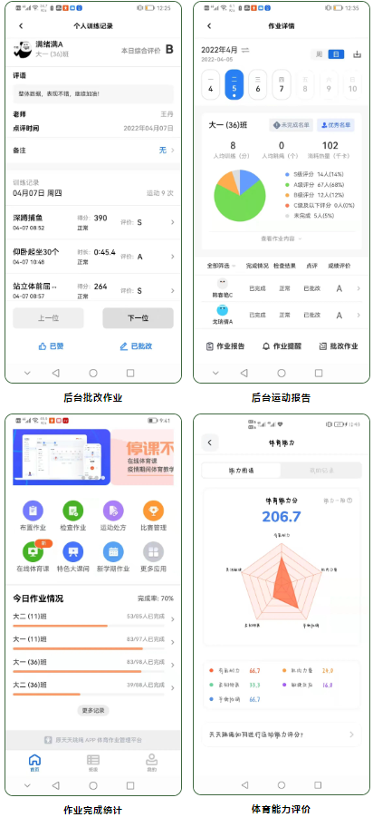 通过后台,教师实时批阅学生作业,监督学生“打卡”,将打卡情况纳入体育课程考核,推动完善“健康知识+基本运动技能+专项运动技能+体质测试”的体育教学评价体系。