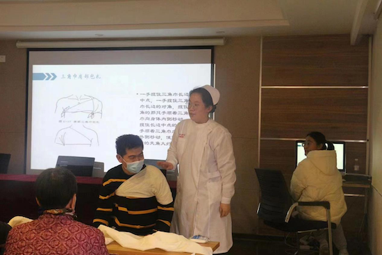 作为医学生,服务队利用周末和假期走进村庄,走入社区,用自己学到的医学知识服务民众。除了心肺复苏术,志愿者还为居民讲解伤口包扎、创伤止血等应急救护知识。“把这个地方放在距离眉弓一厘米处,经耳上方……”这是志愿者在讲述伤口包扎方法。居民们也纷纷拿起三角巾,模仿志愿者的做法,将三角巾折叠并置身于鼻梁上方操作着。志愿者一遍遍地指点,尽管嗓子已经沙哑,双手不知重复了多少遍,但他们仍然在耐心讲解和不厌其烦地重复动作。队员们说:“当看到他们掌握了技巧,我们心中也很自豪。”