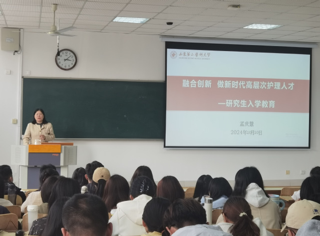 孟庆慧院长从学校的发展历程、学科建设、师资力量以及办学条件等多个方面向大家进行了详细的介绍。她指出,作为山二医学子,我们要融合创新,做新时代高层次护理人才。孟院长对研究生同学们提出三点要求:一是热爱自己的职业与专业,充分认识到其重要性与价值,不应低估自己所学专业的意义和潜力;二是专注于学术研究,深入探索学术领域的真谛;三是增强团队合作意识,提升集体凝聚力和团结精神。她传达了对新生在专业认同、学术研究和团队合作等方面的全面期望,旨在促进同学们的全面发展,成为更优秀的专业人才。
