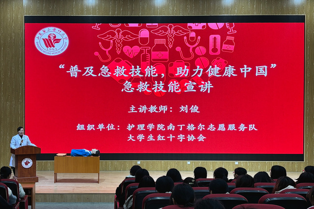 近日,为普及急救技能,提高学生应对突发事件和意外伤害的应急处置能力,bat365中文官方网站南丁格尔志愿服务队联合大学生红十字协会,举办心肺复苏术(CPR)与自动体外除颤仪(AED)专项技能培训会,大学生红十字协会指导教师刘俊主讲,全校近200名学生参与。