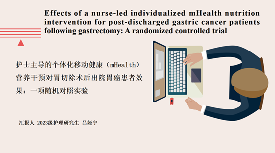 研究生吕娅宁分享了一篇关于胃癌术后患者营养管理的随机对照试验。这是一项由护士主导、基于健康行动过程理论(HAPA)设计的个体化mHealth营养干预。通过“iNutrition”微信小程序(提供个性化食谱、营养计算、症状管理及同伴交流)结合定期电话咨询,显著改善了患者的营养状况(PG-SGA评分)、增加了能量与蛋白质摄入、减少了体重丢失,并强化了患者的营养行为相关认知信念,凸显了护士在术后延续性护理中的核心作用。研究生王辛宇汇报了一项针对社区衰弱前期老年人的随机对照试验,其研究创新性地通过移动健康平台,将包含柔韧性、平衡性、抗阻和有氧训练的多组分运动方案整合到老年人日常生活中。结果显示,该干预方案能显著逆转衰弱前期状态,并有效改善身体功能、骨密度及减少久坐行为。研究为解决中国老龄化问题提供了可复制、低成本的数字化干预新思路。